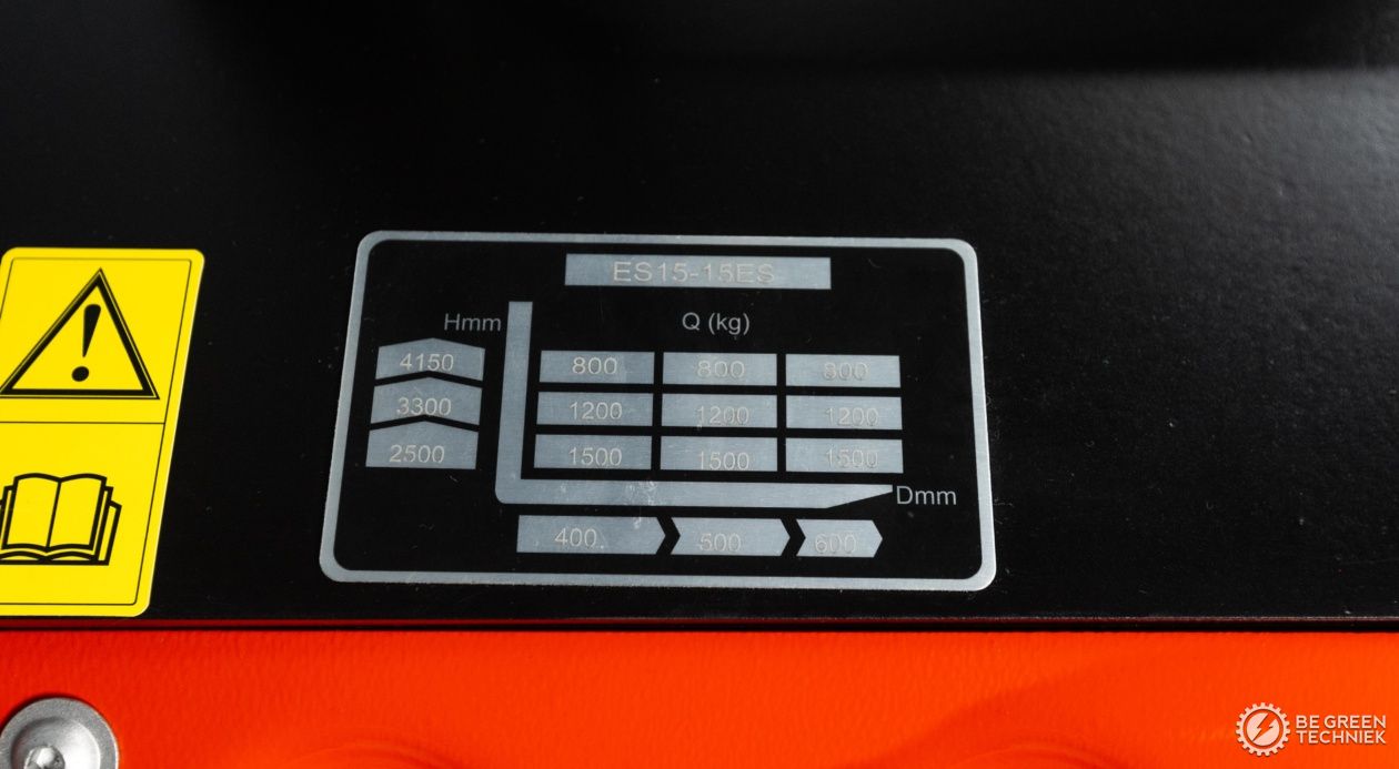 De ES15-15ES heeft een hefcapaciteit van 1.500 kg en een hefhoogte van 4.150 mm. Dit model kiest u als hogere hefhoogte ten opzichte van de ES12-12ES belangrijk is. Of als u meer hefcapaciteit zoekt.